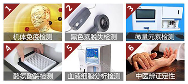 由于白癜风发病原因复杂,赣医中研特设白斑黄金检测中心,通过黑色素脱失、微量元素、血常规、黑色素缺失程度、免疫五项等检查。精准查明引起白癜风的各项病因及诱因,使诊疗更加全面、精确,为治疗提供依据。