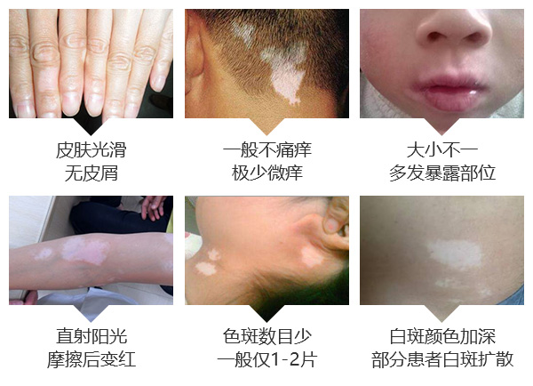 皮损常为乳白色,表面光滑无皮疹。白斑境界清楚。