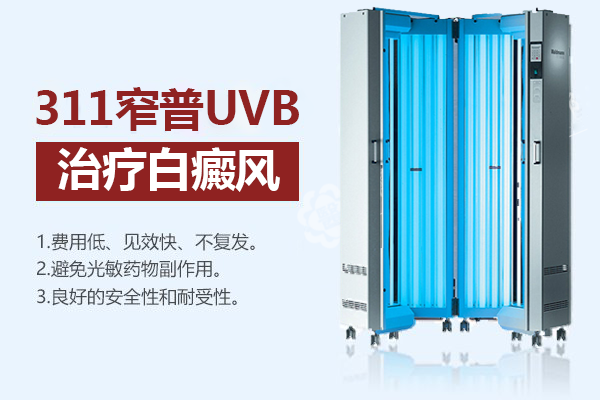 采用窄谱UVB(311nm)直接照射皮损,可诱导T细胞凋亡,刺激黑色素细胞的增殖和移行,激活酪氨酸酶的活性,使黑色素合成增加。同时,UVB具有免疫抑制作用,可使黑素细胞免受破坏,从而达到治疗白癜风的目的。