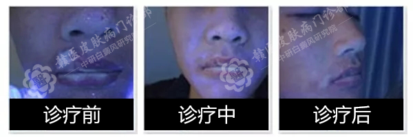 检测白斑:wood灯检测,黑色素脱失严重,病情正处于进展期。