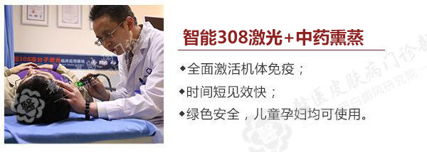 先采用中药渗透打开皮肤毛孔,控制白斑扩散,再采用美国308激光,快速激活体内失活黑色素,疗程短,见效快,抗复发。
