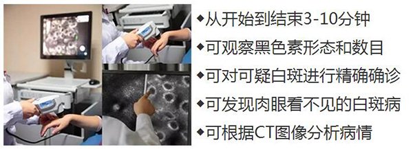 三维皮肤CT是基于光学聚焦原理,利用计算机三维断层成像技术,在皮肤表面即可扫描并集成图像,可用肉眼直观的看到病损区黑色素细胞的数量、形态及发展变化,准确的判断白癜风症状问题。>>>皮肤CT费用是多少?