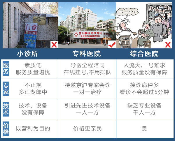 相较于综合医院,赣州中研作为江西省白癜风规范化诊疗基地,治疗仪器和专家一对一治疗保障疗效;与小诊所比较,赣州中研收费更加公开透明、治疗更加科学,避免了偏方治标不治本的问题。