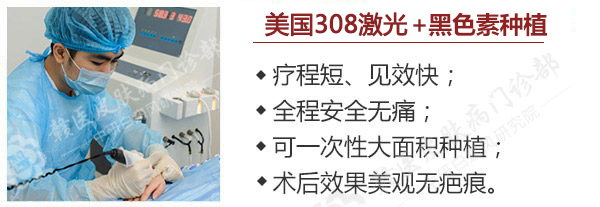 我院在临床治疗发现,在常规治疗方案中增加一项美国308极速激光,疗效可提高30%。鉴于期安全迅速的治疗效果,在临床治疗中不断融合优化,总结出“美国308极速激光”联合祛白理念,将美国308极速激光的治疗应用于常规治疗中,达到褪白事半功倍的效果。