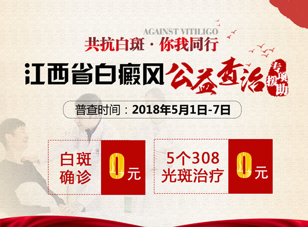 目前白癜风疾病存在普遍的漏诊、误诊、误治现象,令患者苦不堪言,赣医中研作为江西省白规范化诊疗医院,特于 5月1日-7日举行公益普查专项援助活动,解决白癜风临床误诊、漏诊等问题,助力更多白癜风患者得到科学有效的治疗。